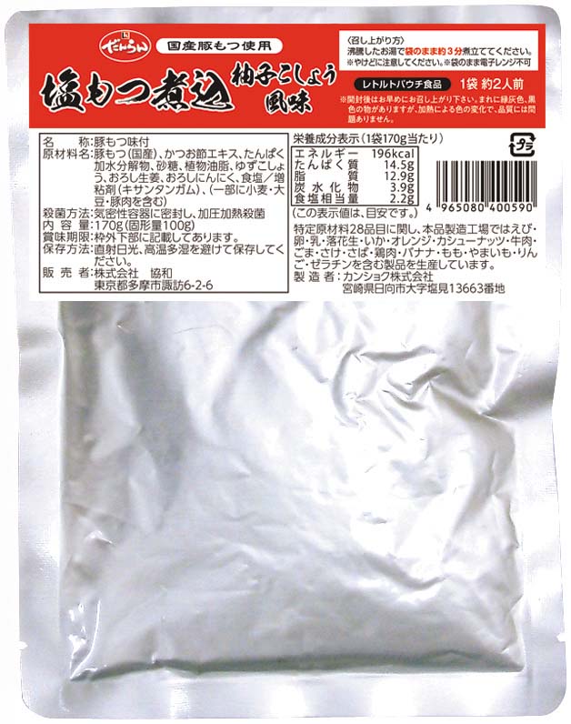 規 格 : 170g(固形量100g) 賞味期間: 365日 国産豚もつ使用。国産の豚もつを塩ベースの味付けでやわらかく仕上げました。柚子こしょうの風味があとを引くおいしさです。