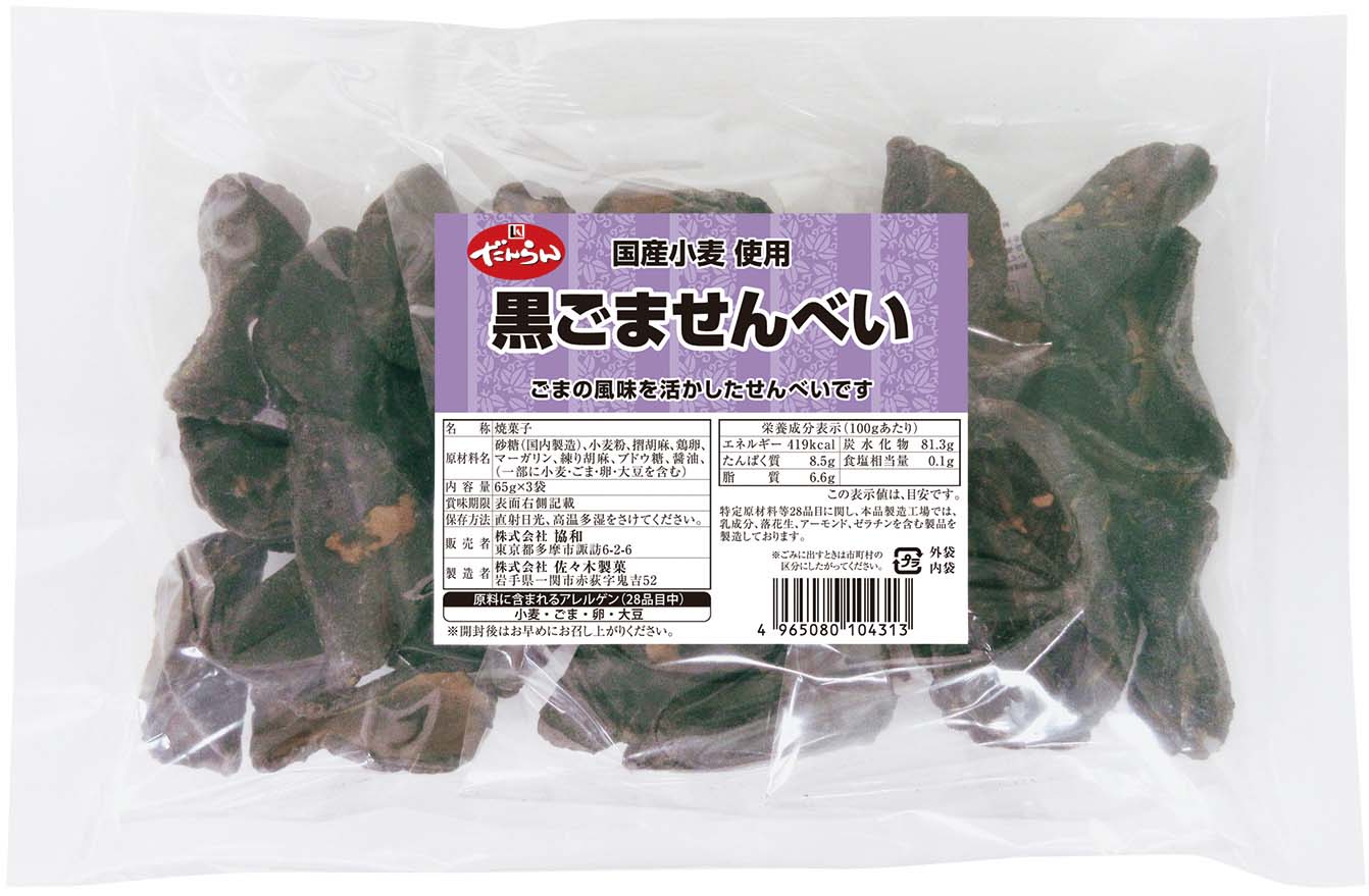 規 格 : 65g×3袋 賞味期間: 90日 黒胡麻の風味と素朴な甘さの小麦せんべいです。