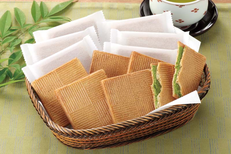 規 格 : 12枚 賞味期間: 90日 国産小麦・宇治抹茶使用。ほんのり甘い小麦せんべいに風味豊かな抹茶を使用したクリームをサンドしました。